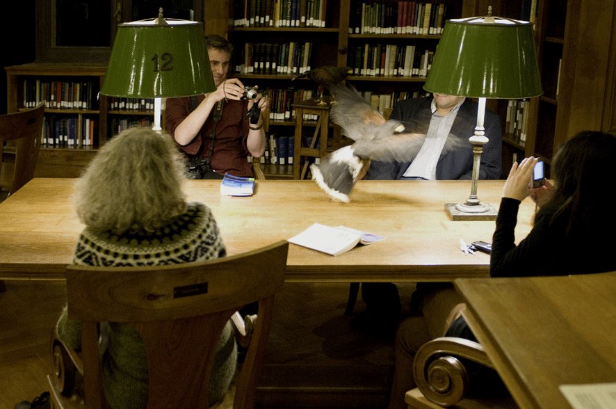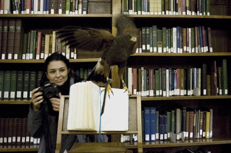 The Gold Revolution is a site specific performance for the Arthur and Janet C. Ross Library at the American Academy in Rome. In the past, the idea of a possible spiritual development of man was associated with an element of absolute symbolic value, gold. Like alchemists believed in the recurrence of four historical eras, the Age of Gold, Silver, Bronze and Iron, so the artist expressed the conviction of an organic and cyclical nature of an imminent transition from the contemporary Iron Age to a new Golden Age. Now, three hawks fly freely around the library, turning it into a disturbing and uncertain environment, imbued with a tangible sense of decadence and catastrophe. On the reading tables, a few history books on the subject of revolution and liberation, chosen by Stefania Tutino (AAR 2014, Professor and Associate Dean of Humanities and Fine Arts, UCLA) and some poems by Roman authors chosen by Laura Cingolani (a Roman poet).